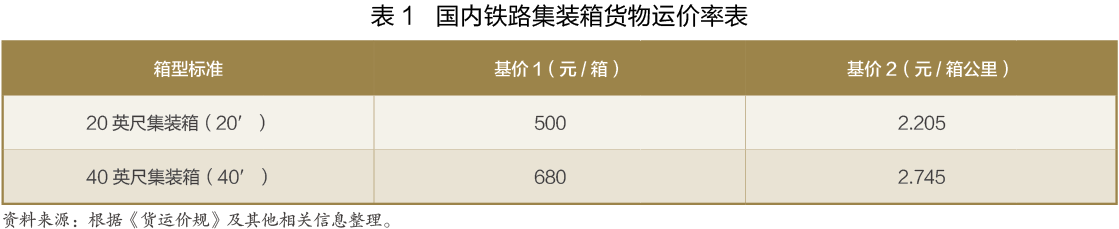 根據(jù)《中華人民共和國鐵道部鐵路貨物運(yùn)價規(guī)則(鐵運(yùn)[2005]46號)》(以下簡稱“貨運(yùn)價規(guī)”)以及國家發(fā)展改革委發(fā)布的關(guān)于調(diào)整鐵路貨物運(yùn)價價格的相關(guān)通知文件(《國家發(fā)展改革委關(guān)于調(diào)整鐵路貨運(yùn)價格進(jìn)一步完善價格形成機(jī)制的通知》發(fā)改價格〔2015〕183號),國際鐵路聯(lián)運(yùn)的國內(nèi)段集裝箱貨物運(yùn)輸?shù)摹盎鶅r1”(也稱發(fā)到基價)為500元/TEU(20英尺箱)和680元/FEU(40英尺箱),“基價2”(也稱運(yùn)行基價)為2.205元/TEU*公里和2.754元/FEU*公里(見表1)。集裝箱貨物每箱運(yùn)費(fèi)的計算方法為基價1+基價2×運(yùn)價公里。此外,按照鐵路相關(guān)規(guī)定,國際鐵路聯(lián)運(yùn)的國內(nèi)段運(yùn)輸,還需要繳納電氣化附加費(fèi)、新路新價均攤費(fèi)、鐵路建設(shè)基金等費(fèi)用,由于項目較多且近年來有所調(diào)整,在此不再贅述。值得一提的是,2016年11月,國家發(fā)展改革委發(fā)布《關(guān)于清理規(guī)范涉及鐵路貨物運(yùn)輸有關(guān)收費(fèi)的通知》(發(fā)改價格〔2016〕2498號),要求相關(guān)收費(fèi)主體限期清理規(guī)范鐵路貨物運(yùn)輸過程中除鐵路運(yùn)價之外的各種收費(fèi),其中涉及鐵路運(yùn)輸企業(yè)的收費(fèi)包括鐵路貨物運(yùn)輸雜費(fèi)、向?qū)S镁產(chǎn)權(quán)或經(jīng)營單位收取的專用線代維修代維護(hù)等費(fèi)用。