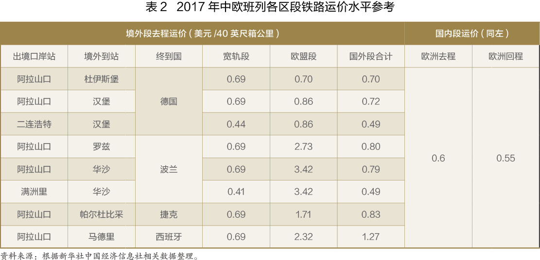 根據(jù)2017年各班列運(yùn)行線路公布的運(yùn)價水平,寬軌段的去程平均運(yùn)價水平大多為0.69美元/大箱公里,經(jīng)二連浩特和滿洲里出境利用西伯利亞大陸橋的運(yùn)價較低,約為0.4美元/大箱公里;歐盟段的去程平均運(yùn)價水平差異較大,根據(jù)不同線路走向,從0.7美元/大箱公里至3.42美元/大箱公里不等,高運(yùn)價率的區(qū)段一般是由于運(yùn)輸里程較短,固定費(fèi)用分?jǐn)傒^多所致。國內(nèi)段的去程平均運(yùn)價水平約在0.6美元/大箱公里,回程平均運(yùn)價水平約在0.55美元/大箱公里(見表2)。